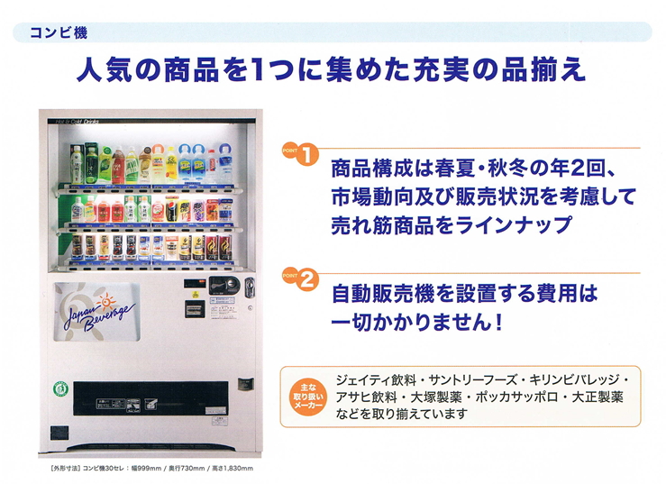 コンビ機(各メーカーの人気商品が入っています。)アサヒ・サントリー・キリン・ダイドー・JT・ポッカなど。